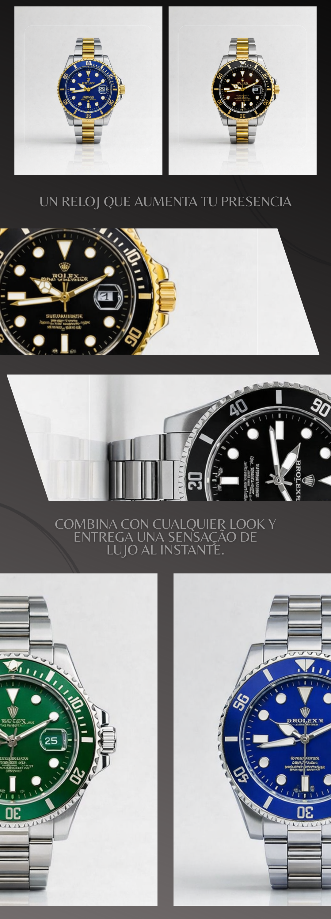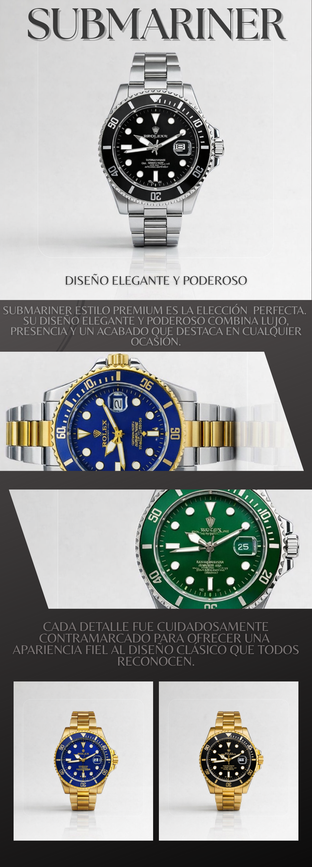 Si buscas un reloj que impacte a primera vista, el Submariner Estilo Premium es la elección perfecta. Su diseño elegante y poderoso combina lujo, presencia y un acabado bicolor que destaca en cualquier ocasión.