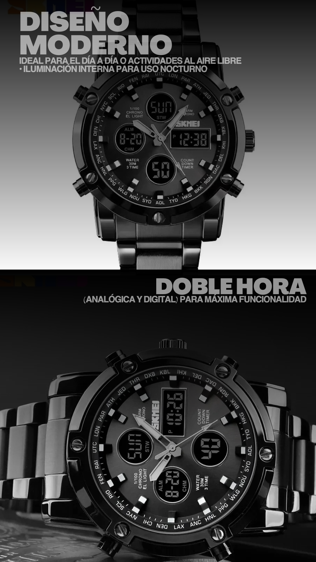 • Doble hora (analógica y digital) para máxima funcionalidad